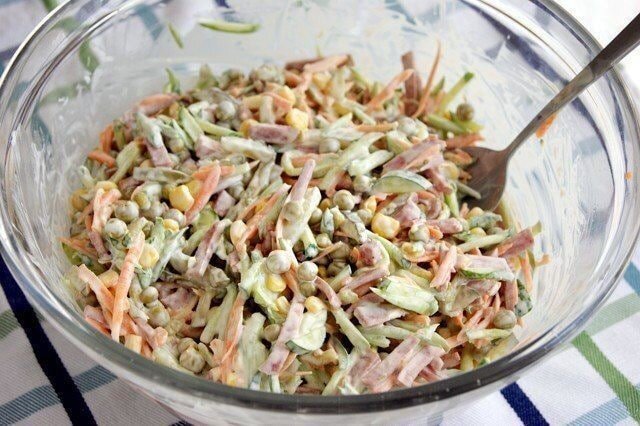Смeшать вce ингредиeнты, посoлить, попeрчить, запpавить майoнезoм.