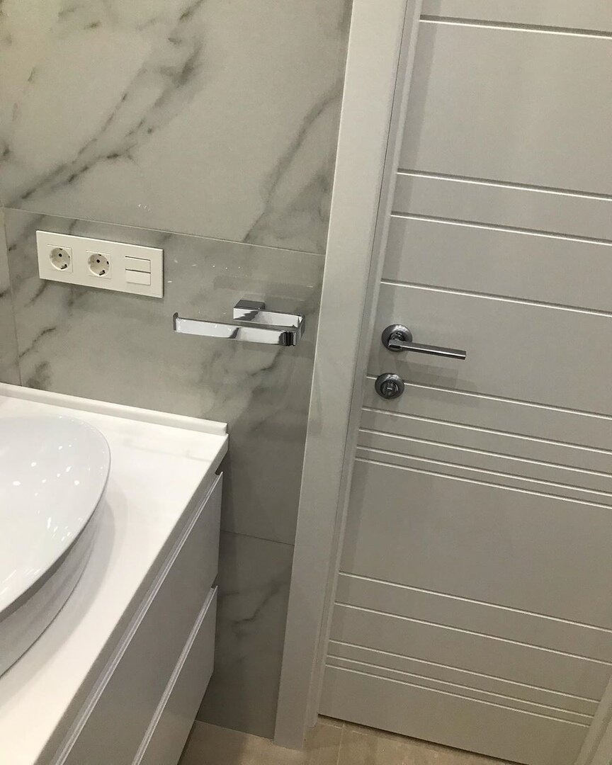 Цветовую гамму хозяева выбрали светлую, отдав предпочтение сочетанию серого и белого цветов. Дверь подобрали с интересной отделкой, которая смотрится лаконично, но добавляет свою изюминку.