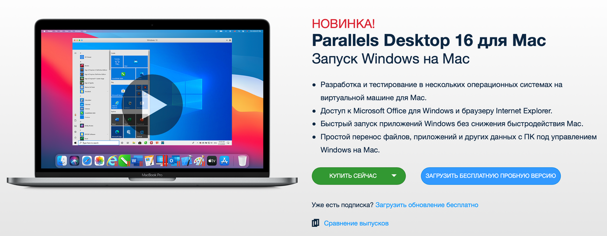 Сегодня мы разберем как поставить Windows 10 на Mac с помощью виртуальной машины Parallels Desktop. С помощью этой программы мы легко сможем установить и запустить Windows 10 внутри системы Mac. Этот способ является самым удобным и производительным. Если вы обычный пользователь, которому нужно запускать программы Windows на Mac, то это единственный вариант в котором не нужно глубоко разбираться с настройками. Программа эта платная, но кто хочет тот всегда сможет найти ее бесплатно (конечно же я против пиратства и подобное решение может использоваться только в ознакомительных целях и обучении), саму программу можно взять с официального сайта здесь. На момент установки доступна 16 версия.
