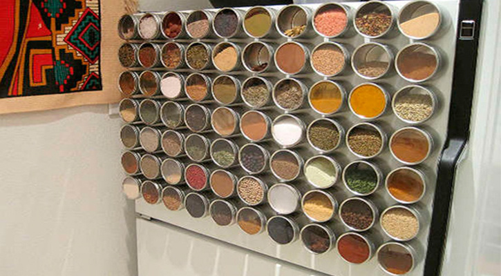 - пересыпать специи в маленькие баночки, приклеить на крышки магнитики и примагничивать их снизу к кухонному рейлингу или к металлическому листу, поверхности холодильника;