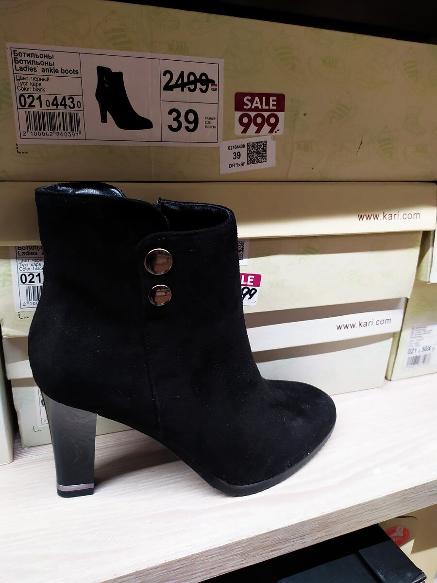 Интересная и недорогая модель. Чёрные полусапожки на высоком устойчивом каблуке, с декоративной застёжкой. Цена 999 рублей.