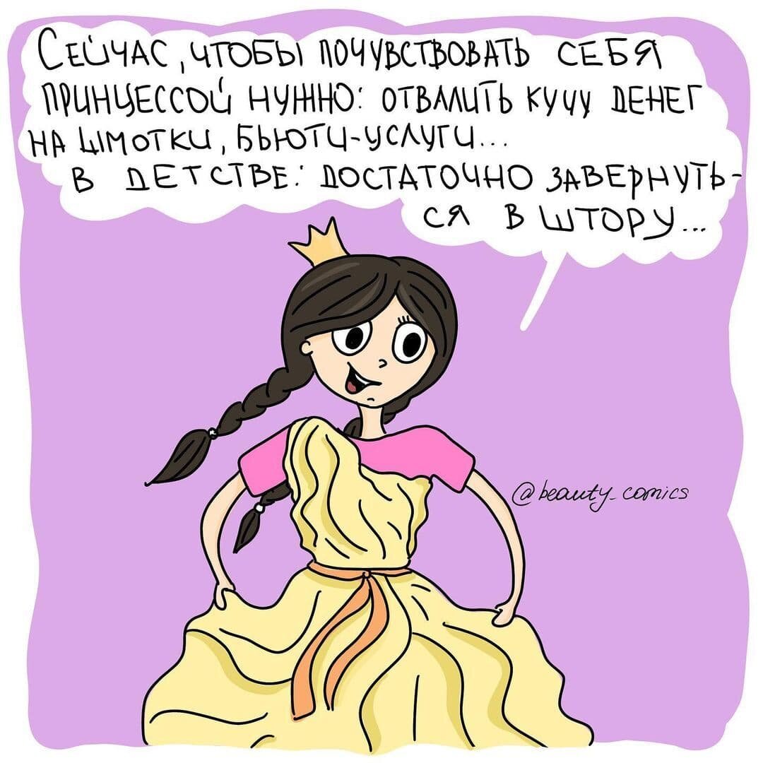 В детстве было все проще, даже с красотой. Стоит завернуться в штору или покрывало, как уже чувствуешь себя настоящей принцессой. И не нужны никакие ноготочки, реснички, прически и прочее.