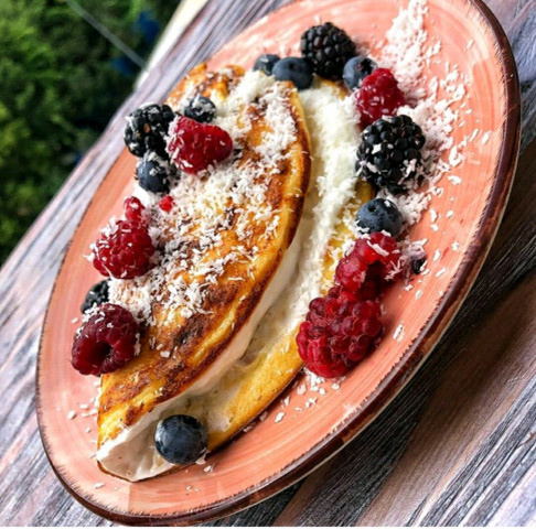 Тем временем смешиваем творог с сах.замом. Смазываем уже готовый блин, складываем его, добавляем ягоды.