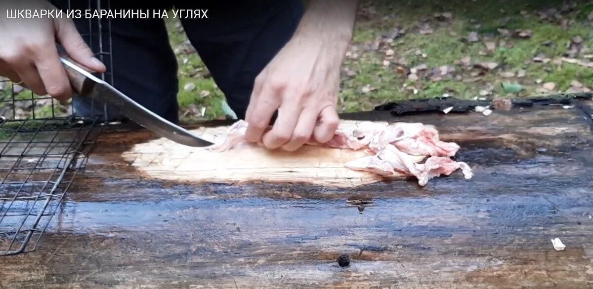 Выпейте за здоровье и срежьте весь жир с бараньей туши. Нарежьте его полосками и положите на решетку.