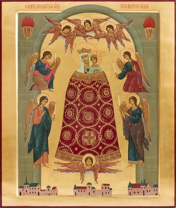 На иконе изображена дева Мария и её младенец под большим покровом, означающий единение матери и ребёнка.