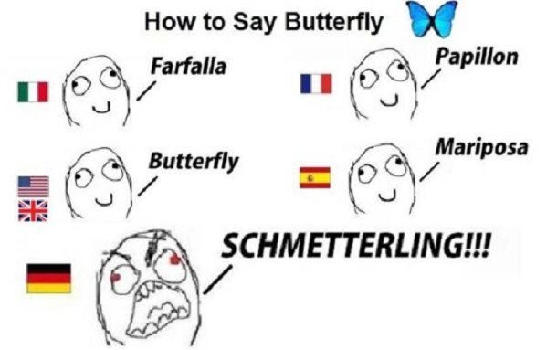 Раз уж зашла речь о насекомых, поговорим о милых бабочках. Оказывается, слова англ. butterfly и нем. Schmetterling практически однокоренные. Сейчас поясню за этимологию и расскажу, откуда в бабочке масло (butter). На первый взгляд в словах ничего общего. Но оба они во ходят ко временам суеверий и охоты на ведьм. По одному из поверий ведьмы могли принимать облик бабочек, когда отправлялись
