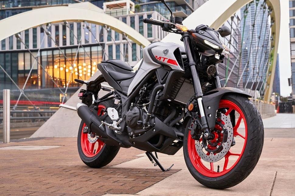 Компактный байк построен на легкой диагональной раме из 35-миллиметровой стальной трубы. Прочная конструкция с креплением мотора в четырех точках обеспечивает хороший запас жесткости при низком весе. Еще одна общая черта нейкеда МТ-03 и легкого представителя серии суперспорт YZF R-3 — удлиненный асимметричный маятник,
