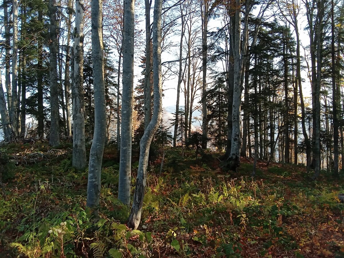 По гребню уходила вверх типичная звериная тропка. Хребет постепенно поворачивал вправо, поэтому скоро между деревьями стали мелькать не только плато Черногорье и хребты Мессо и Нагой-Чук, но и вершины Пшеха-Су и Фишт. Мы были в предвкушении выхода на вершину. До неё оставалось меньше трех километров.
