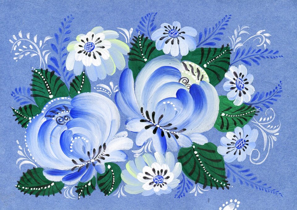 В Волховской Росписи, в отличие от Урало-Сибирской - более сдержанная гамма. В цветах и листьях не больше двух цветов.