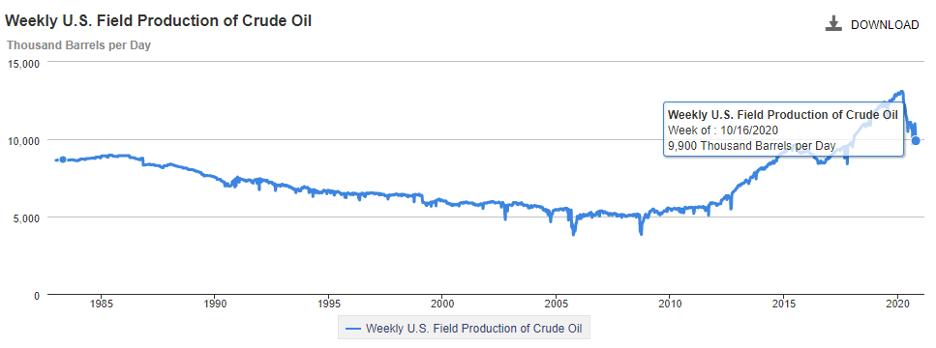 В США добыча нефти упала ниже 10 млн барр./сутки. Сейчас этот показатель ~9,9 млн барр./сутки.