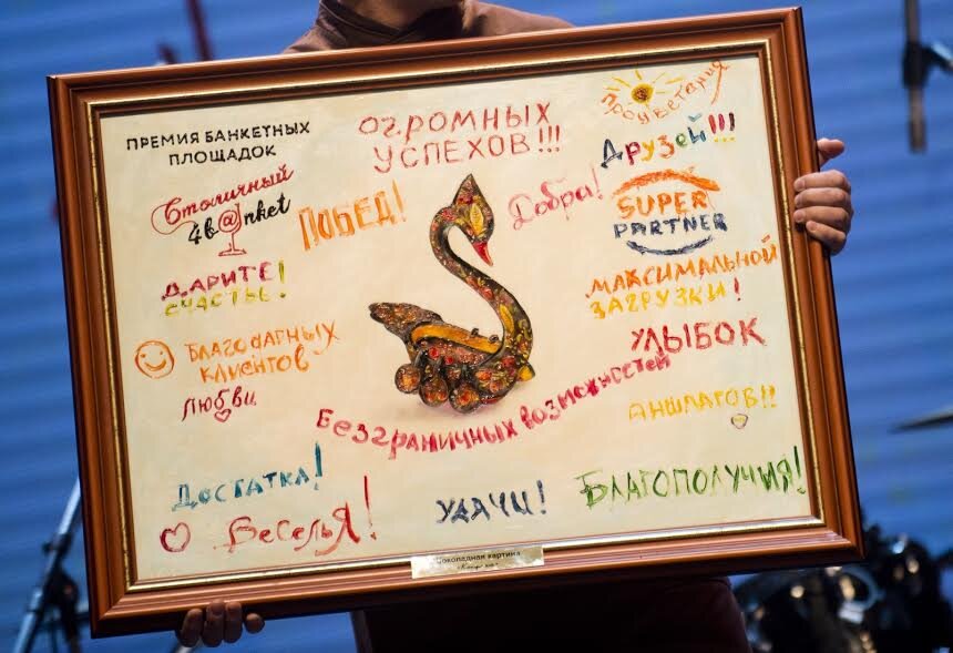 Кстати, совсем недавно 15 февраля состоялся праздничный банкет посвященный церемонии награждения победителей Премии 2016 «Столичный банкет», учредителем которой является наш ресурс 4banket.ru. Так вот на нашем банкете была такая шоколадная картина, на которой все желающие могли написать свои пожелания для команды 4БАНКЕТ и всех участников мероприятия. По-моему, всем очень понравилось! А в качестве памятного презента все участники церемонии получили вкусные и красивые шоколадные карточки.