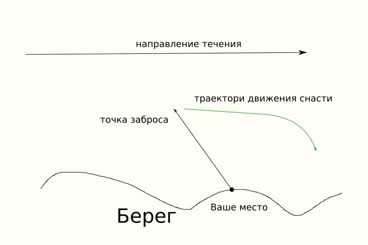 - Чем выше по течению вы забрасываете — тем сильнее будет провисать шнур когда шнур будет перпендикулярно течению.