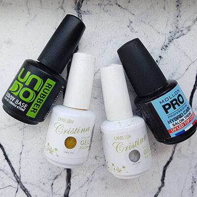 Сначала наносим базу и цветное покрытие. Сегодня мы выбрали нежно-желтый оттенок, смешав белый и желтый гель-лаки (Cristina 1323 и Crisitna 1432).