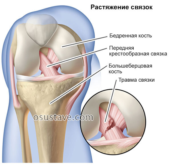 Если растяжение связок коленного сустава сопровождается гемартрозом , это влечет появление эластической припухлости в зоне переднебокового угла сустава, при прощупывании этой припухлости ощущается зыбление. Если наружная или внутренняя боковая связка разорваны полностью, заметны нарушения походки: нога становится нестабильной в суставе, это проявляется хромотой или подворачиванием голени. При обследовании сустава в этом случае обычно не наблюдается гемартроз,виден только отек, кровоподтек становится заметным позже.Если имеет место разрыв боковых связок, прослеживается чрезмерная подвижность (нестабильность) голени при её отклонении силой. В данных условиях диагностика разрыва крестообразных связок на ранних этапах осложняется отсутствием возможности исследования симптома выдвижного ящика, который обычно прослеживается при растяжениях или разрывах крестообразных связок. Изучение этого симптома становится возможным только через несколько дней, когда кровоизлияние сойдет само по себе, или после пункции сустава и эвакуации крови. При неполном разрыве связок (растяжении связок коленного сустава), который не вызывает резкого болевого синдрома и гемартроза, лечение обычно заключается в наложении тугой повязки в форме восьмерки и воздействии холодом (сначала), а через 1–2 дня — теплом. Также применяют УВЧ, электрофорез на область повреждения. При растяжении связок колена разрыв собственной связки надколенника или травма сухожилия квадрицепса характеризуется резким нарушением походки: нога пострадавшего подгибается при попытке на нее опереться; при полном разрыве невозможно поднять ногу прямо: бедро поднимается, а голень провисает. Гемартроза при этой травме не бывает. При такой форме растяжения связок коленного сустава лечение должно проводиться хирургом. Наиболее типичным осложнением при данном виде травмы является гемартроз – кровоизлияние в сустав. В этом случае растяжения связок колена показана пункция полости коленного сустава с целью удаления из нее крови. Для уменьшения отека и кровоизлияния в область травмы коленного сустава назначается УВЧ терапия. Хороший результат дают теплые ванны, занятия ЛФК, массаж мышц поврежденной конечности, тугое бинтование или иные способы фиксации. Данные процедуры обязательны в течение первых трех недель после получения травмы.