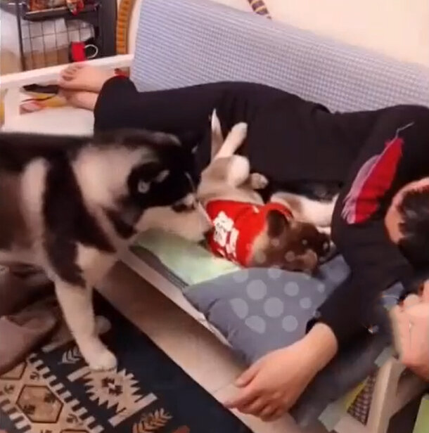 Хаски почувствовала ревность, когда заметила щенка, спящего с хозяином. Умная собачка знала, что делать, чтобы роли быстро поменялись. Камера сняла милого ревнивца на невероятном поведении. Кто его этому научил?