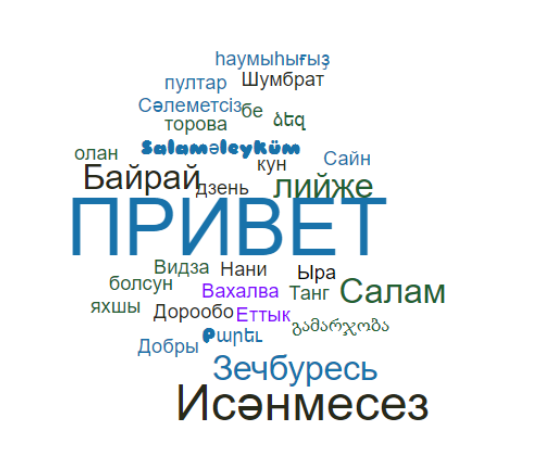 https://worditout.com/word-cloud/create ) и предложите ребятам написать в самом ресурсе все приветствия, которые им известны (включая на русском). Те слова, которые будут использованы больше всего раз (например, слово ПРИВЕТ в данном примере) в облаке тэгов будут самыми крупными. Предложите ребятам еще и погуглить приветствия на разных языках народов России, пусть ваш плакат будет полон многообразия! Я уверена, что такая активность очень понравится ребятам, и парочку новых слов войдут в их обиход !
