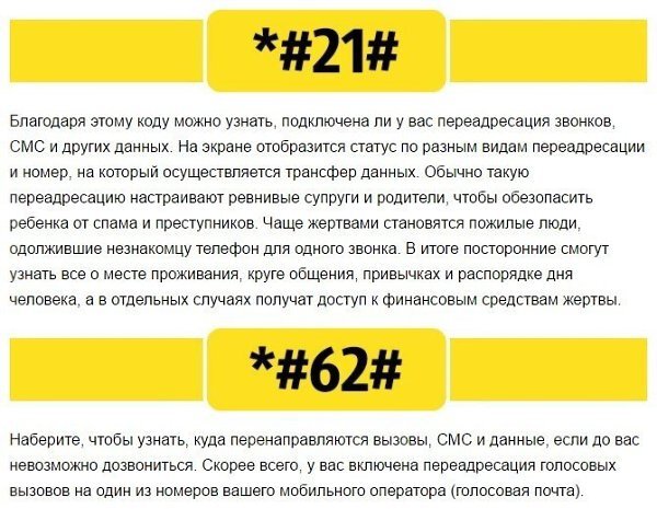 <**21#>-с помощью этого кода вы можете узнать перенаправляются ли ваши звонки сообщения и другие данные статус различных типов, подключенной переадресации и номер на который перенаправляется информация будет выведен на экран вашего телефона. Эту функцию чаще всего подключают либо ревнивые партнеры либо родители которые стараются защитить своих детей от спама и преступников. Более взрослые люди часто становятся жертвами такой практики передавая телефон незнакомца для единственного звонка. Поступая благородно они рискуют предоставить злоумышленникам информацию о месте своего проживания, личностях, членов семьи и друзей, своих привычках и ежедневной рутине и даже о финансовом состоянии