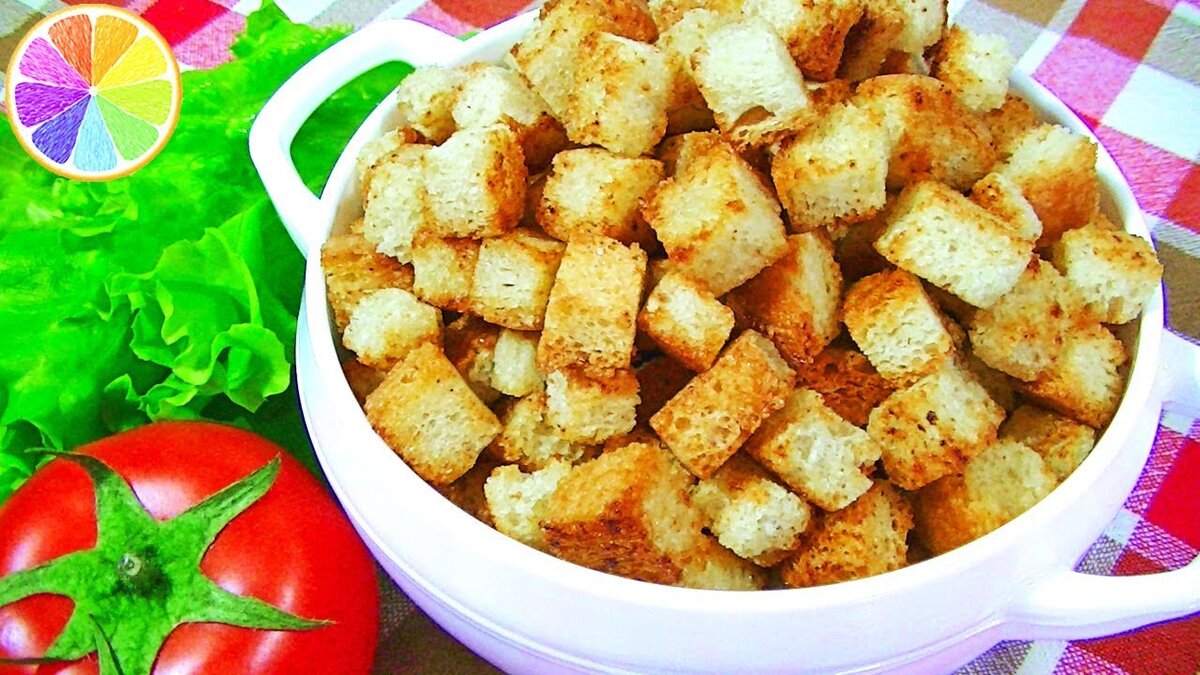 Временем и опытом проверено - если вы решили сделать сухарики дома, то лучше всего купить хлеб для тостов. Именно из него получаются самые воздушные и вкусные гренки для салатов и супов. Купите упаковку тостового хлеба, на разделочной доске нарежьте кубики нужного размера. Нож смочите водой, тосты для нарезки берите сразу по 2штуки.