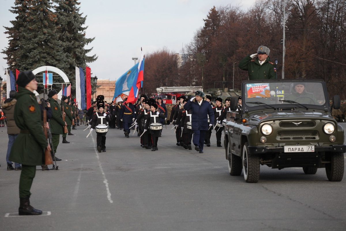 24-ю годовщину Октябрьской революции отметили парадами и в прифронтовом Воронеже и в далеком тыловом Куйбышеве (ныне Самара), выполнявшем роль запасной столицы. В красноармейской шинели в строю стоял тогда Иван Бурмистров, еще год назад работавший токарем на Ульяновском патронном заводе имени Володарского. В ученической шинельке был студент ФЗО Николай Степанов, родом из Мелекесского района. Иван Алексеевич после Куйбышевского парада сразу ушел на фронт, сражался под Москвой и на Курской дуге, за форсирование Днепра получил Золотую Звезду Героя Советского Союза. Николай Иванович сражался на Белгородщине, после войны вернулся в Ульяновск.