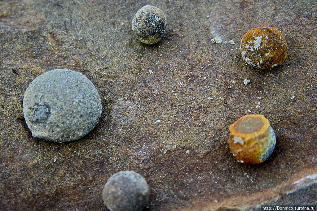...Пока мы купались в Арктическом океане, остальная группа поднялась вверх по склону и уже как полчаса знакомилась с окружающим ландшафтом. Впрочем для наших организмов, только что получивших мощнейший заряд бодрости, догнать остальных не представляло никакой проблемы — мы буквально взлетели по склону и тут же натолкнулись на первых гигантов сферической формы. Судите сами насколько идеально круглой они формы.Чуть выше них находился самый большой из подобных камней, хотя уже и немного разрушенный снизу и по краям. Это делало его похожим на огромный череп... Старожилы этих мест утверждают, что "Череп" разрушается все больше и больше, не иначе как благодаря глупым туристам, которые пытаются залезть на него, либо же столкнуть его с места... ))На первый взгляд такой камень состоит из плотного песчаника. Также кажется вполне логичной мысль, что после спрессовки в осадочных породах под землей он постепенно вышел на поверхность благодаря поднятию коры и постепенно давление его выдавило из склона на поверхность. После чего он просто скатился благодаря своей шаровидной форме вниз по относительно пологому склону и здесь остановился. Это — то, что подсказывает логика — но почему именно шар? Для ответа на этот вопрос карабкаемся наверх в поисках нового материала.Отсюда открывается красивый вид на бухту и узкий южный склон острова, единственный здесь не покрытый ледником. Говорят, что в один из периодов своей истории наша планета Земля была почти вся покрыта ледяным щитом толщиной 3км на континентах и 1км на поверхности океана, который не затрагивал только самые высокие и отвесные горы. Должен признать что этот остров действительно непохож на остальные, что мы до сих пор видели, и непохож именно по своей геологии, по ее разнообразию. Очень много окислившихся железных пород, кремния, песчаников самых разнообразных форм и цветов. И именно среди этого пестрого пейзажа на свет появляются сферические камни.Вот еще один довольно типичный пример, снятый в трех разных ракурсах.По последней существующей версии, которую нам озвучил Франц — штатный геолог на нашем корабле, в основе большинства этих сферолитов лежит органическое ядро, принадлежащее ранее какому-нибудь ископаемому округлой формы, например моллюску. Считается, что большинство отложений на ЗФИ принадлежит к верхнему Юрскому периоду, когда этот участок земной коры находился на дне океана и дрейфовал где-то совсем в иных широтах. А вот как вылупляются наши шарики из менее плотной породы:Спрессованные раковины моллюсков состоят из кристаллов кварцита и марказита — минерала, являющегося соединением в результате химических реакций железа и серы. Вот этот марказит и мог быть главным соединяющим материю элементом, притягивая железо-содержащую породу подобно магниту к круглому ядру. Изначальный размер ядра, особенности его строения, условий залегания и окружающих пород определили дальнейший рост шаров. Как видно только единицы выросли до размера гигантов, большинство шариков легко помещаются на ладони руки.А вот эти два шарика срослись вместе подобно сиамским близнецам, сформировав что-то очень похожее на цифру 8, символически тем самым демонстрируя бесконечность движения материи в природе.Но это пока только версия... Такой статус позволяет развернуться фантазии! Ведь вокруг нас 