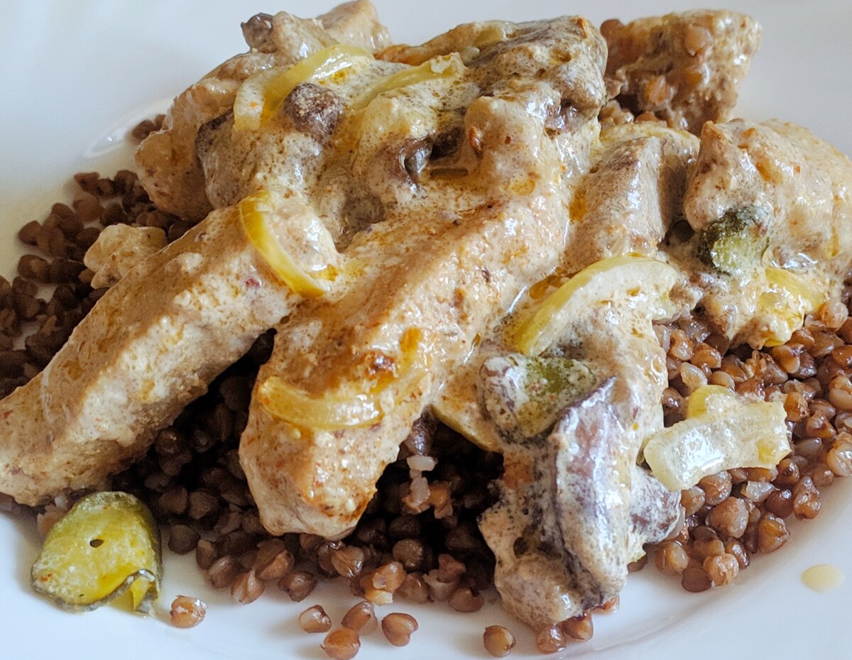 Изначально не собирался публиковать этот рецепт на канале, просто хотел приготовить свинину на ужин, что-то простое. Но в процессе нарезки мяса решил немного усложнить рецепт, тем самым сделать его вкуснее и интереснее. И тут я подумал, что некрасиво будет с моей стороны не поделится такой вкуснятиной с вами, взял в руки смартфон и начал снимать. Ингредиенты: Свинина - 600 гр. Маслята отварные - 300 гр. Огурцы маринованные - 5 шт. Лук репчатый - 2 шт. Сметана - 350-400 мл. Приправа для шашлыка - 1 чайная ложка. Масло растительное для жарки. Соль, перец чёрный молотый - по вкусу Свинину режем брусочками, смешиваем с приправой для шашлыка и оставляем минут на 20. Грибы кладем в сковородку с разогретым растительным маслом и жарим до румяной корочки (в случае с маслятами это дело не быстрое и требует постоянной слежки, вся жидкость должна выпарится). Одновременно с грибами в другой сковороде обжариваем порезанный полукольцами лук и огурцы, порезанные на кружочки. Когда лук приобретет