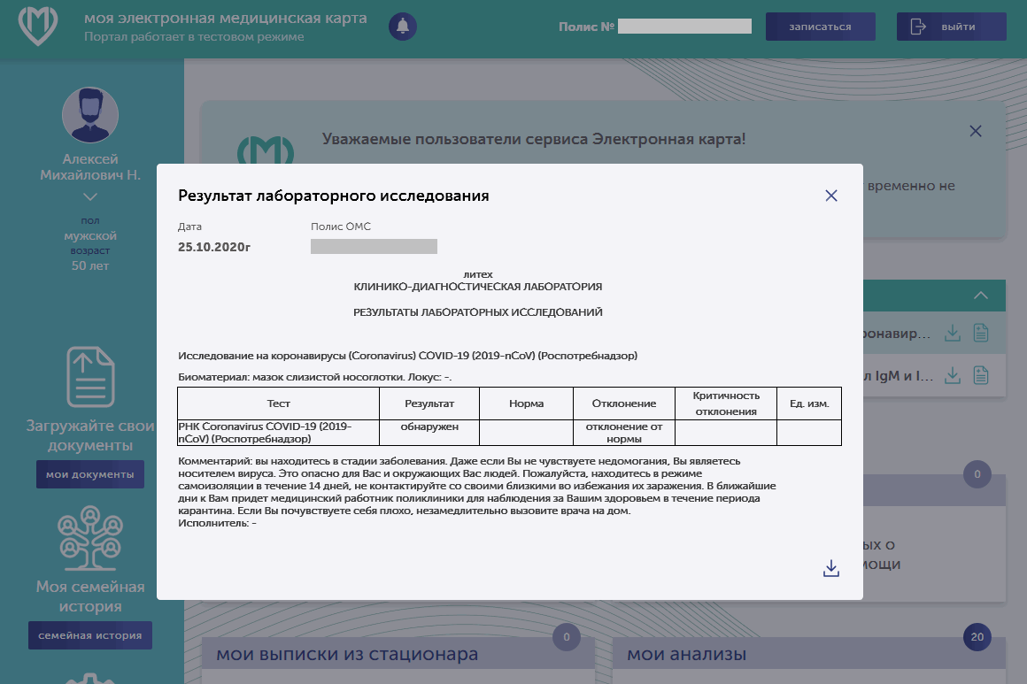 25 октября, воскресенье. В 11 утра пришла СМС от DIT_EMIAS: "Вы сдали тест на коронавирус. Результаты появятся в Вашей электронной медкарте в течение трёх дней". Через два часа позвонили из Департамента здравоохранения и сообщили, что у меня подтверждена коронавирусная инфекция. Сказали не выходить из дома и ждать врача в понедельник. Вечером ещё раз позвонили из Депздрава и спросили, как я себя чувствую.
