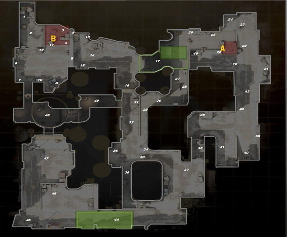Для полноценного взаимодействия с командой необходимо знать основные позиции карты. Всего на Dust 2 можно выделить 49 ключевых точек, определяющих месторасположение вас, тиммейтов или соперников.