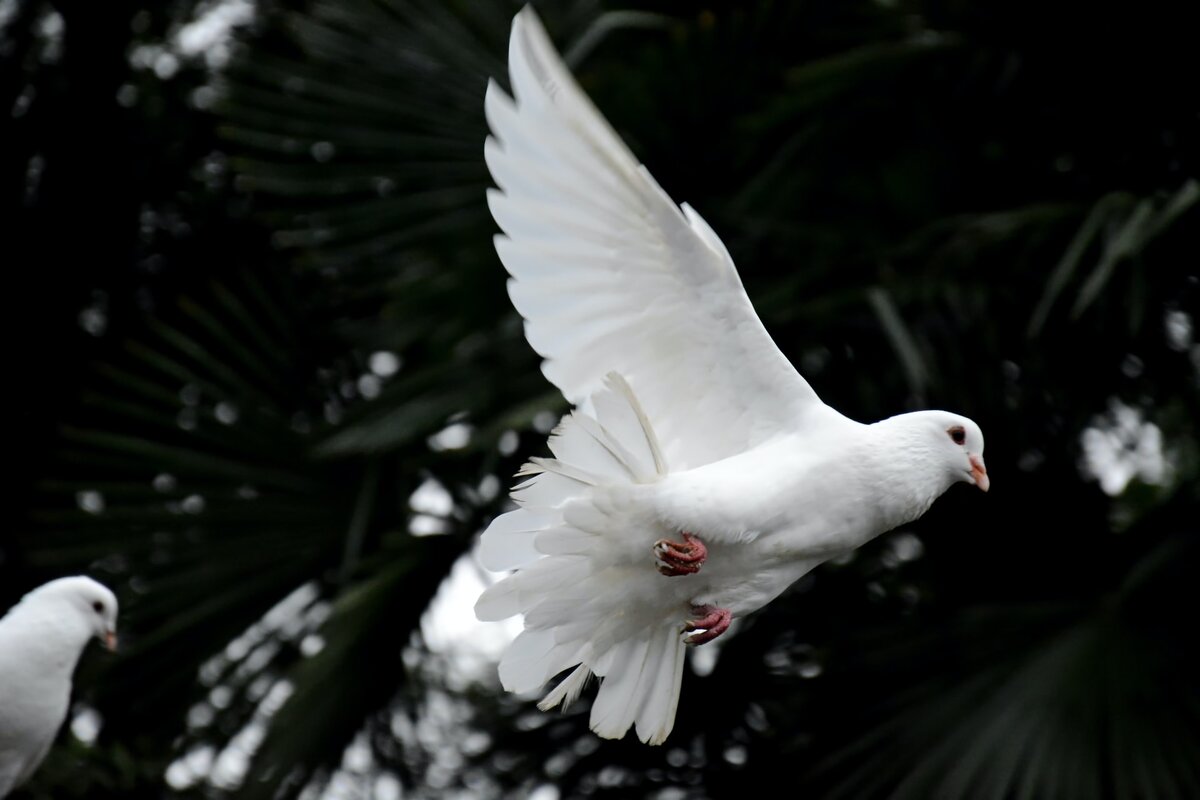 Как-то летним вечером пошли с дочкой гулять. Краем глаза замечаю что-то белое над входом в дом, на проводах. Поднимаю глаза – голубь. Весь белый, только одно перо в хвосте черное. Сидит и смотрит на нас внимательно. Я подумала, что это странно, ведь голуби,