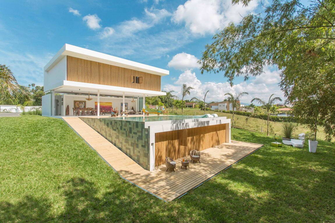 Этот современный дом построен в пригороде колумбийского города Перейра. Он расположен на небольшом склоне и запроектирован с учётом как потребностей заказчика, так и особенностей местности, климата, географического контента и расположения. Бамбуковые ставни со стороны дворового фасада могут находиться в трёх положениях: закрытые, полностью открытые или частично открытые (только окна). Общая зона, расположенная на первом этаже, выполнена в виде крытой террасы. На склоне устроен открытый бассейн, под которым находится ещё одна площадка для отдыха. Название: Дом-галерея (Gallery House)
