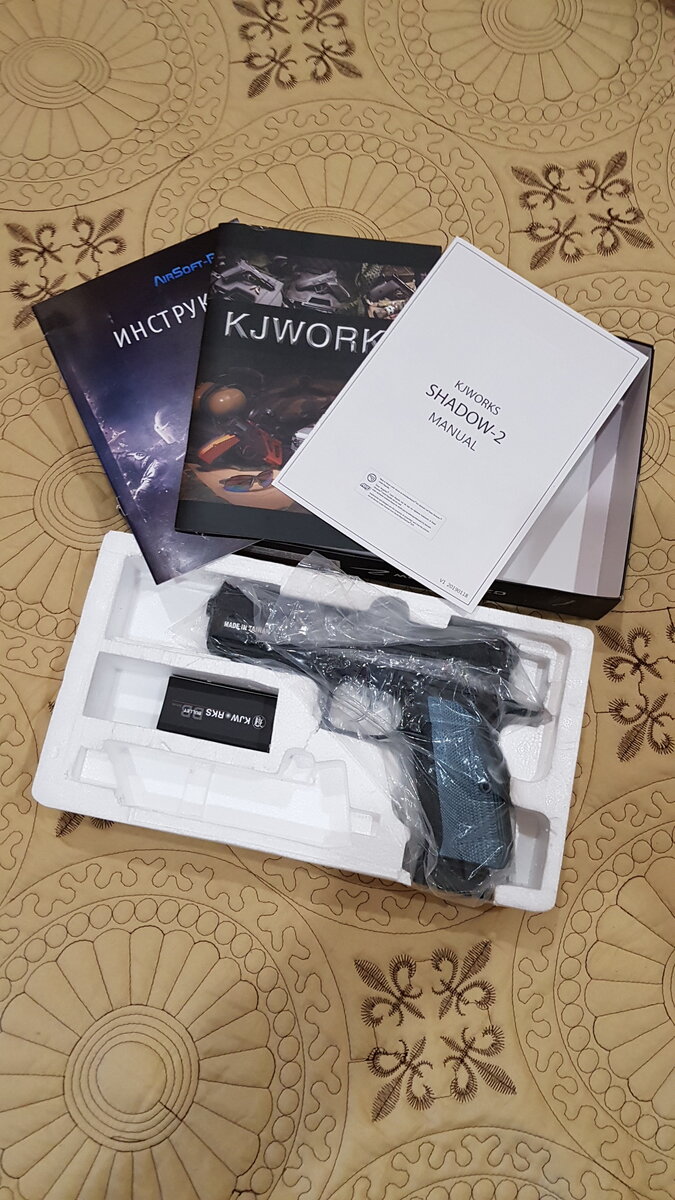 В комплекте был сам пистолет, green gas магазин, небольшое количество шаров, шестигранник, каталог kaji works и инструкция.