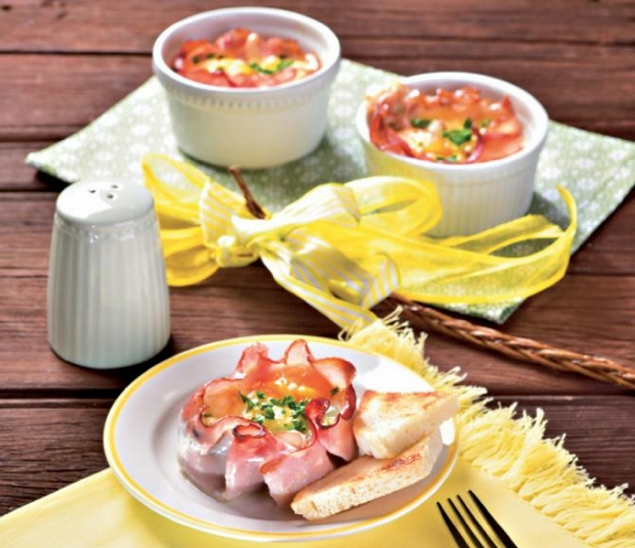 Смажьте противень (или формы для кексов) небольшим количеством масла и выложите на них ветчину придав ей форму гнезда.