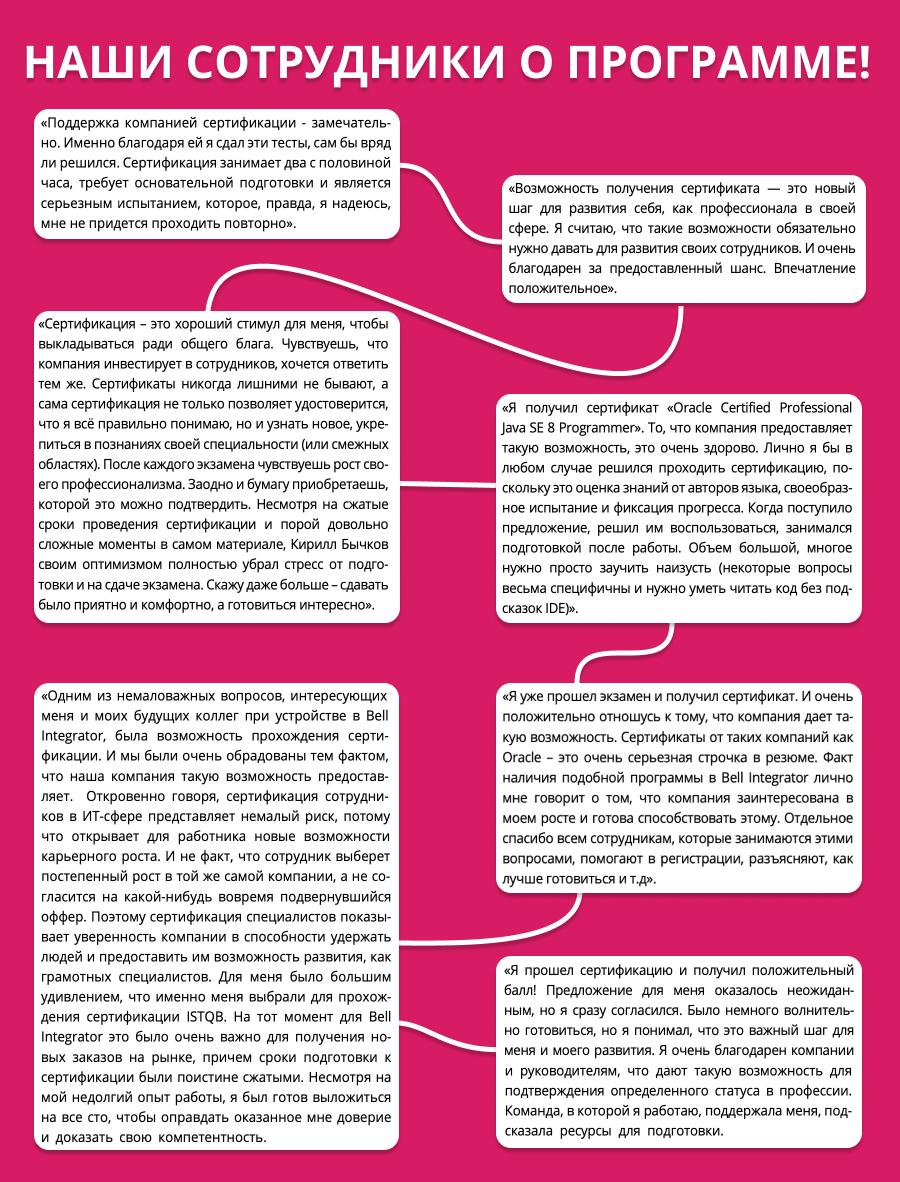 «Нынешняя инициатива имеет для нас колоссальное значение: мы не только подтверждаем профессионализм наших сотрудников, но и вместе с этим повышаем качество своей работы. Кроме того, в ряде случаев это становится для нас первым шагом к установлению долгосрочных отношений с крупнейшими заказчиками страны. Уникальные компетенции специалистов необходимы для успешного участия в важных тендерах по разработке и тестированию. Поэтому в планах Bell Integrator и дальше регулярно проводить сертификацию, как минимум раз в квартал. Мы рады, что в этот раз на нашу программу откликнулось так много коллег. Особо хочется отметить то, что подготовка к экзамену проходила самостоятельно, с использованием специализированной литературы и дампов. Правда в целях координирования программы и оказания помощи в освоении новых знаний нами в Slack был создан закрытый канал, где можно было поделиться опытом и обсудить варианты пробных задач. Надеемся, что для Bell Integrator подобные инициативы станут хорошей традицией на долгие годы».
