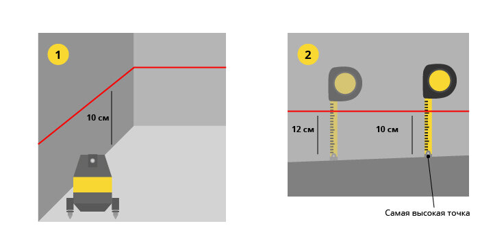 - Чтобы найти самую высокую точку, лазерный уровень выставляется на произвольную величину. Удобнее брать целое значение: 10 см, 50 см, 1 м. Рулеткой проверяем расстояние от луча до пола. Место, в котором расстояние будет минимальным и будет самой высокой точкой.