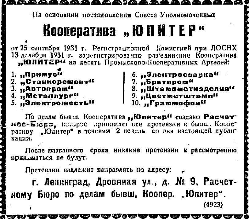 Итак, как я уже рассказывал, кооператив "Юпитер" был раздроблен на 10 артелей. Организатор "Юпитера" Пожаров получил с барского плеча производство примусов "Цветметштамп" в Красногвардейске (Гатчина). На 7-й Советской появилось новое руководство.