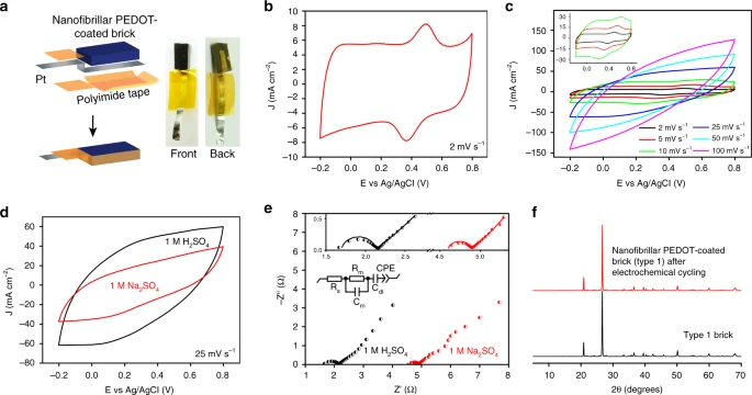 Если говорить простыми словами, то кирпич превращают в суперконденсатор с помощью добавления оксида железа и паров кислоты. После этого через полости пропускают другой газ, который вступает в реакцию с железом, а в результате поры кирпича покрываются пластиком, который обладает свойствами электрического проводника, который назвали PEDOT. Более подробно химическую реакцию и сам процесс можно увидеть на этой картинке: