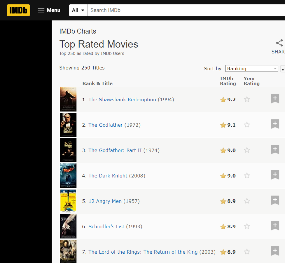 Данный фильм по праву занимает свое почетное первое место во всемирном топе IMDB с оценкой в 9.2: