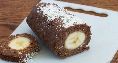 6. Сверху кладём банан. Лучше порезать его на кусочки, чтобы была ровная колбаска.