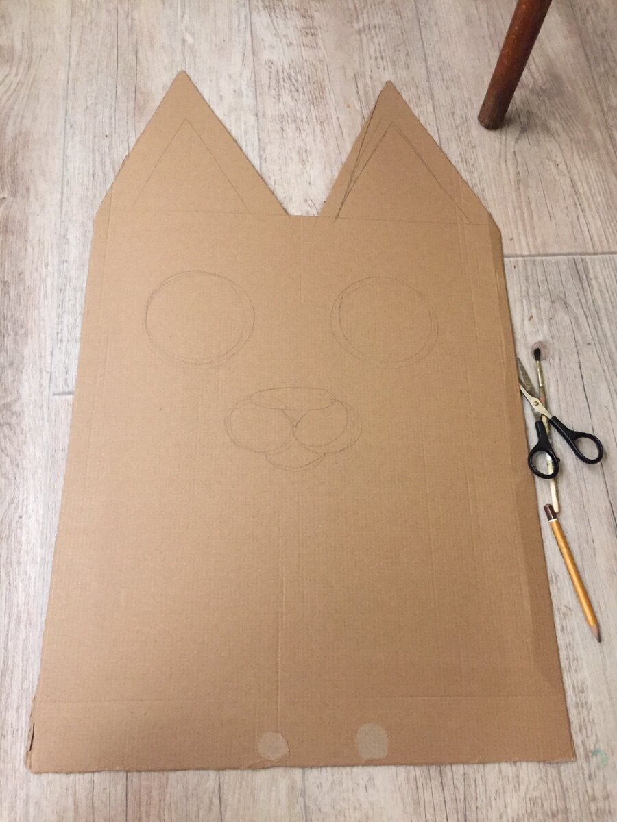 Сначала рисуем мордочки животных - мы выбрали кота и лису. И вырезаем канцелярским ножом.
