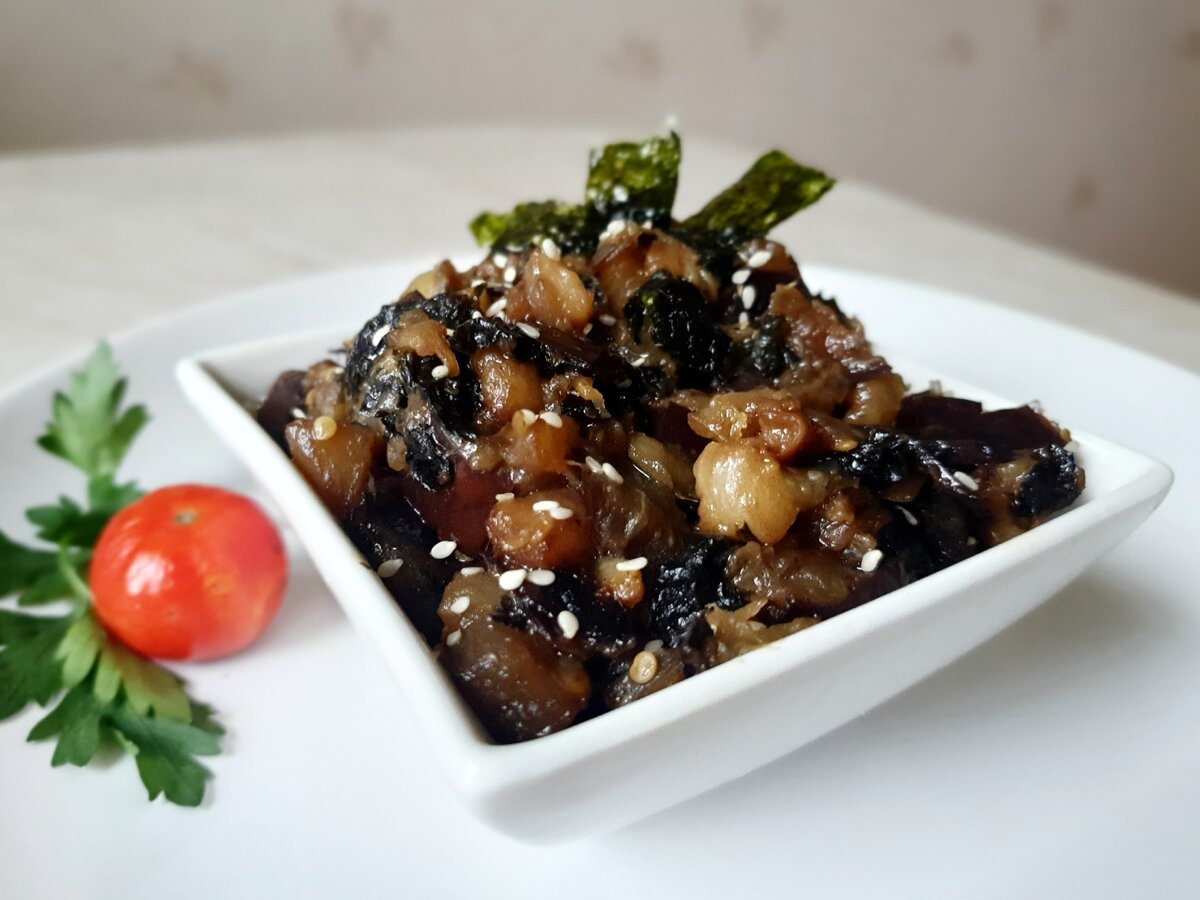 Баклажан нарезать кубиками, обжаривать на раст.масле. Добавить соевый соус, уксус, готовить под крышкой на медленном огне до готовности. Нарезать или наломать нори, перемешать. При подаче посыпать кунжутом.