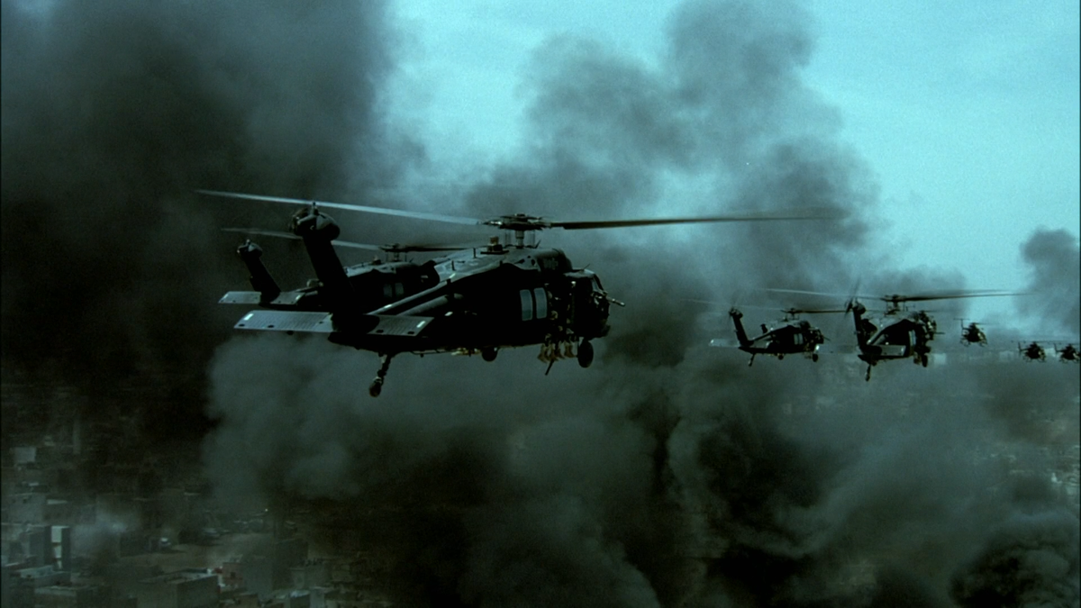 Но он, так скажем боится подъехать из-за милиции Айдида. Опасаясь, что его заметят и убьют. Генерал Гаррисон сказал, что он сам убьет его, если он не укажет им место. После команды "Айрин", вся база пришла в движение. Солдаты сели в вертолеты и под великолепную музыку полетели. Сцена снята просто шикарно. Летящие черные ястребы на фоне прибоя захватывают дух. К тому же, в этой сцене просто великолепный саундтрек.