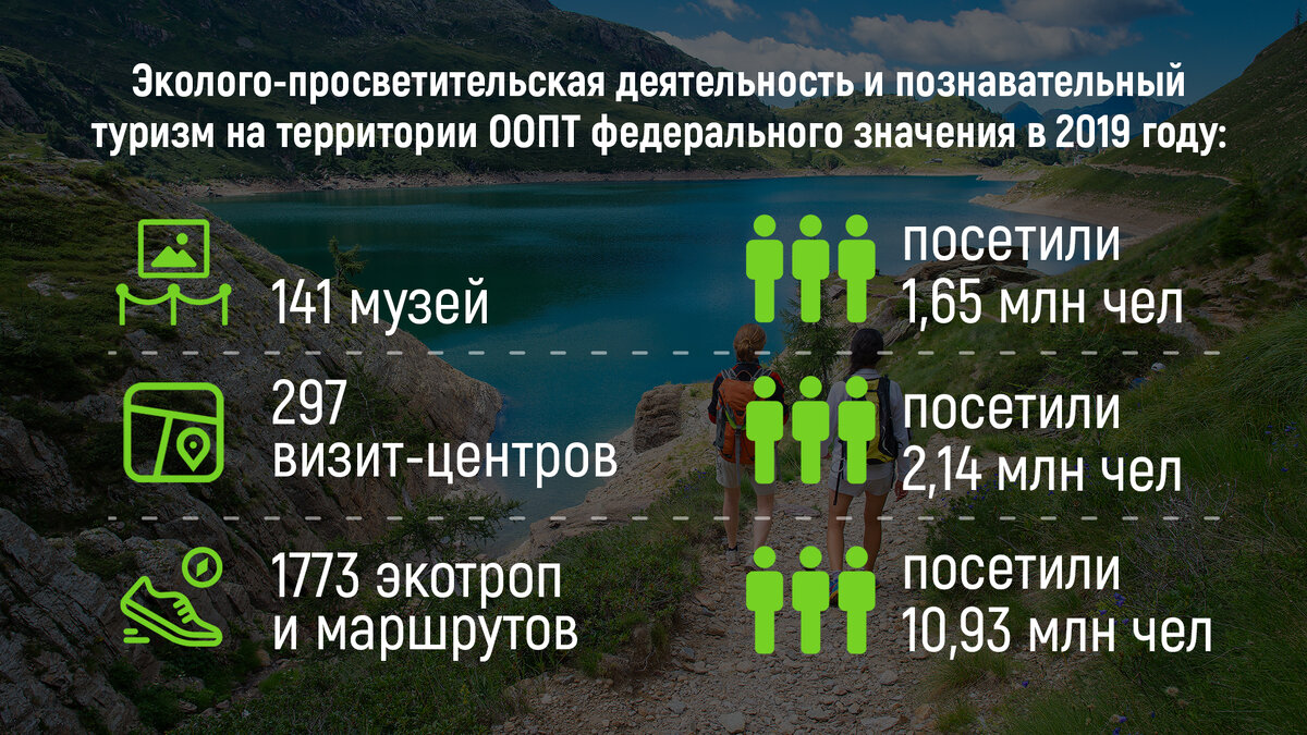 Так вот, возвращаясь к тому хозяйству, которое есть сейчас в сфере охраны окружающей среды, - это действительно большое хозяйство. У меня есть статистика, цифры по итогам девятнадцатого года. Так вот, только на федеральных особо охраняемых природных территориях находится 141 музей, который принимает более полутора миллионов посетителей ежегодно. Визит-центры- 297 штук, и через них проходит 2140000 человек в год. Экотропы и маршруты-1 1773 штуки и посетителей почти 11 млн. человек в год.