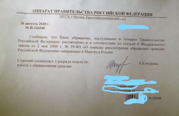 Стала я ждать что правительство мне ответит. Пришел ответ в середине сентября. В большом конверте. С красивой надписью «Аппарат Правительства Российской Федерации». В извещении было тоже важно так написано: письмо ПРАВИТЕЛЬСТВЕННОЕ, Ну, думаю, сейчас там благодарность будет изложена и извинения: мол, простите, Ольга Николаевна, не досмотрели, что именно президент в поручении написал, спасибо, что указали, сейчас всё исправим. Вскрываю. А там бумажечка в четыре строчки: сообщаем, что ваше обращение рассмотрено и направлено в Минтруд России.