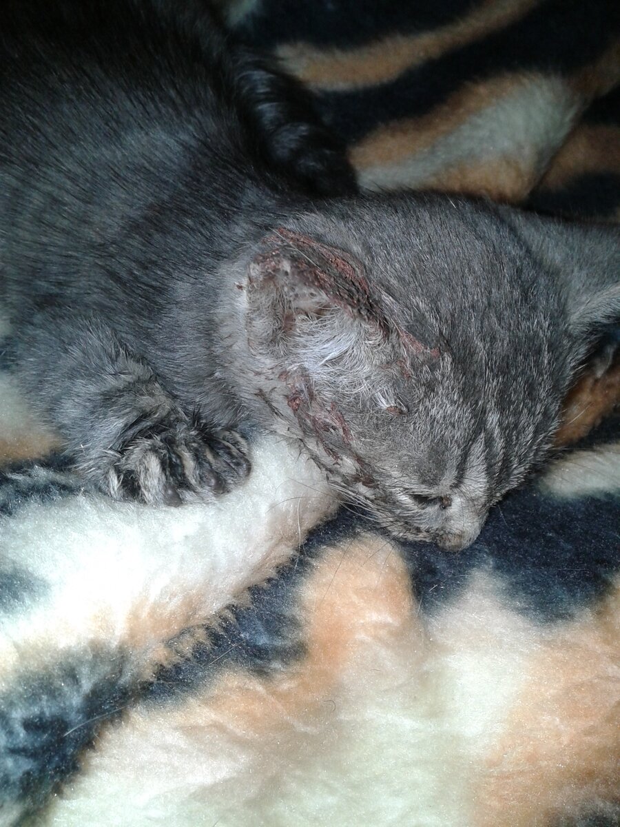 У малыша было сильно повреждено ухо, мордочка, правая лапа. Я быстро соорудила ему спальное место в коробке из-под обуви, принесла воду и пресервы. Конечно, котёнок не реагировал ни на что, но дабы предотвратить обезвоживание я вооружилась шприцом и начала поить котейку. Как же он хотел пить! Миллилитров 20 пил, не останавливаясь, даже приоткрыл один глаз, чем очень меня порадовал. Я уложила его спать в коробку и закрыла в отдельной комнате, чтобы мои любопытные питомцы не трогали его, пока я буду на работе.