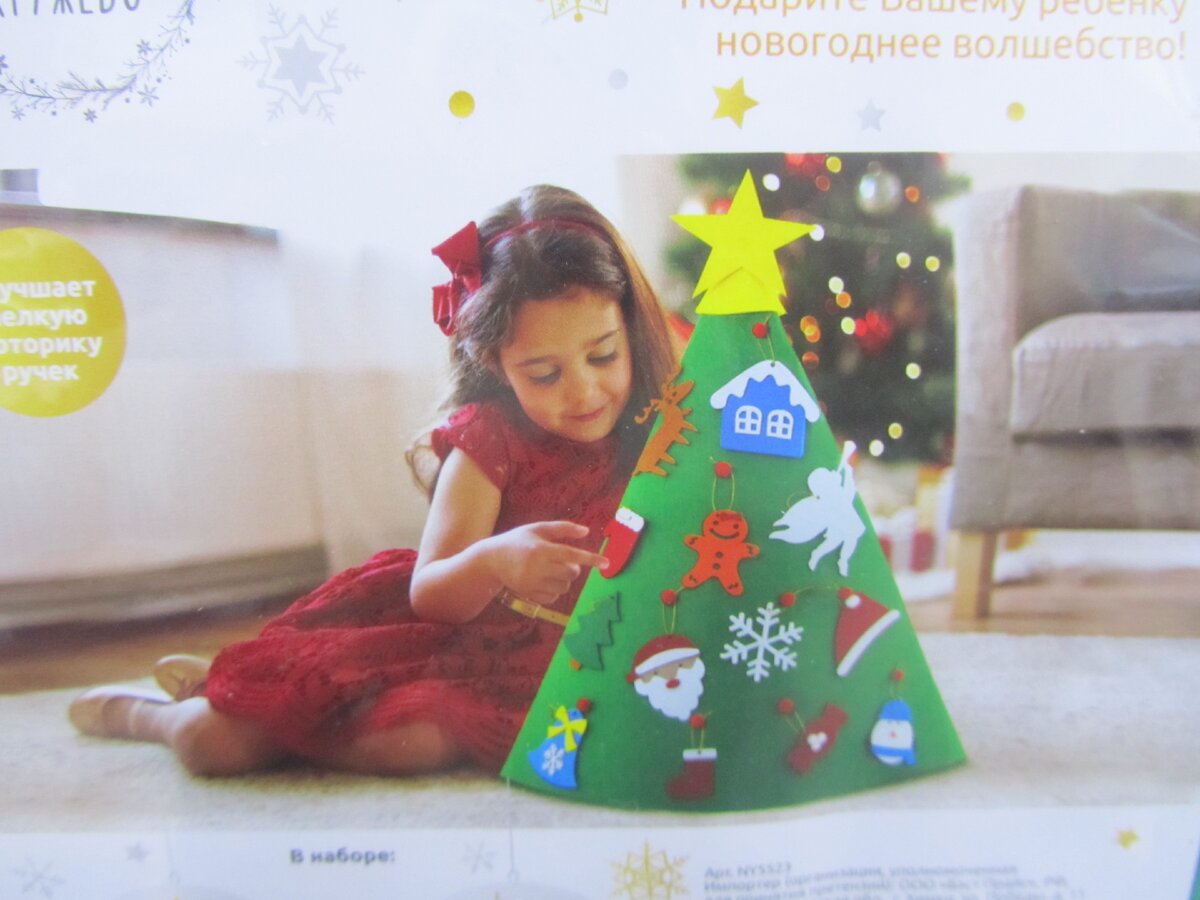 Это такой конус из фетра с красными шишками, на которые ребенок может сам повесить игрушки. Игрушки входят в комплект, их 16 штук, выполнены тоже их фетра.