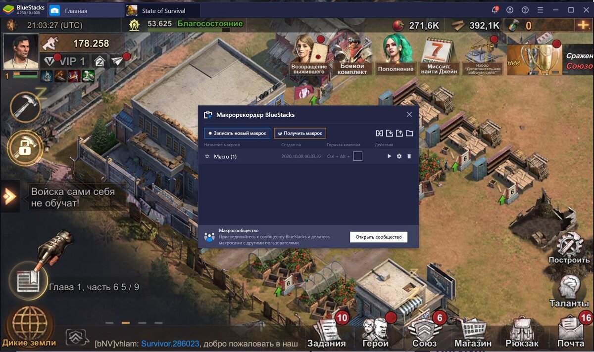 BlueStacks существенно ускоряет и оптимизирует геймплей State of Survival. Как и в любой мобильной стратегии, State of Survival полна гринда, ожидания таймеров и циклически повторяющихся обязательных “прокликиваний” базы и войск. Чтобы не упускать полезное время для развития, используйте Макрорекордер от BlueStacks. С его помощью можно автоматизировать клики по зданиям, улучшениям и другие полезные действия.