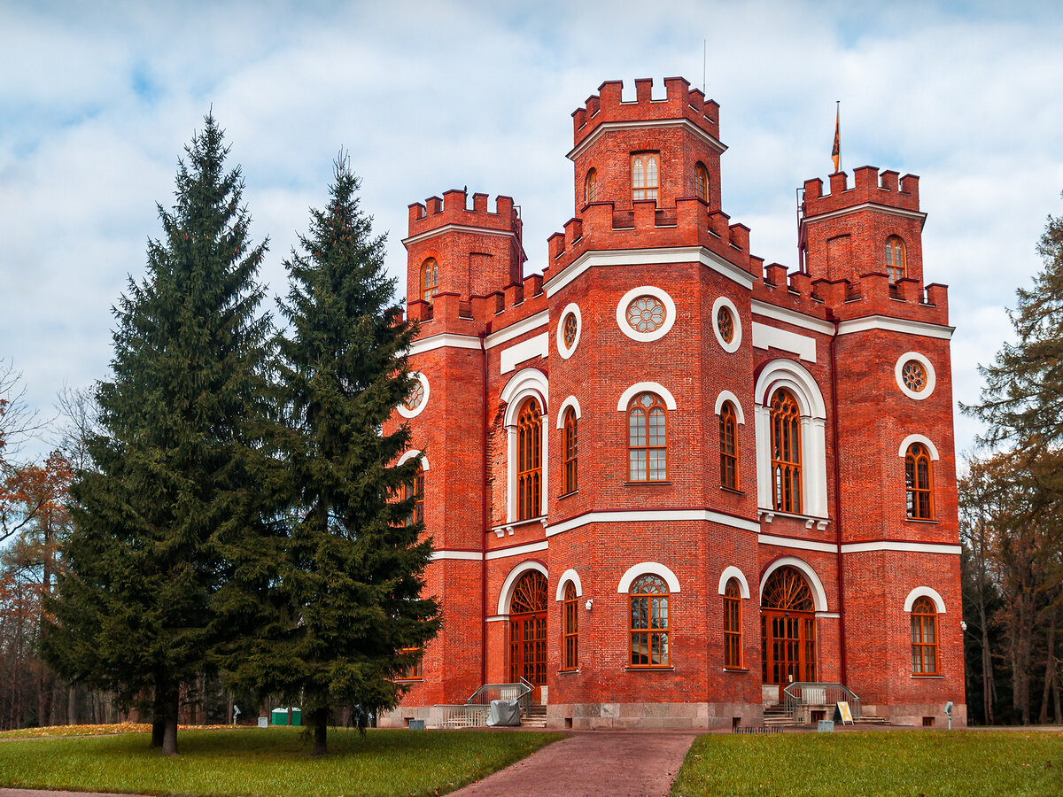 Стены из красного кирпича в контрасте с белой отделкой, зубчатый парапет и башенки, высокие полуциркулярные и маленькие круглые окна с переплетам в готическом стиле - все это напоминало средневековый рыцарский замок.