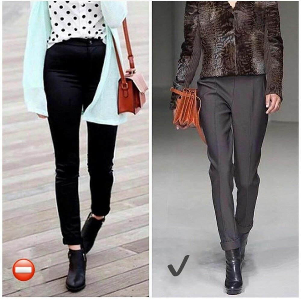 Но и слишком длинные брючины могут испортить впечатление от образа. Если она собираются в складки, то создается ненужное утяжеление и визуально искривляет ноги. Менять брюки на другую модель или обрезать длину в этом случае не стоит, достаточно просто немного подвернуть штанины.