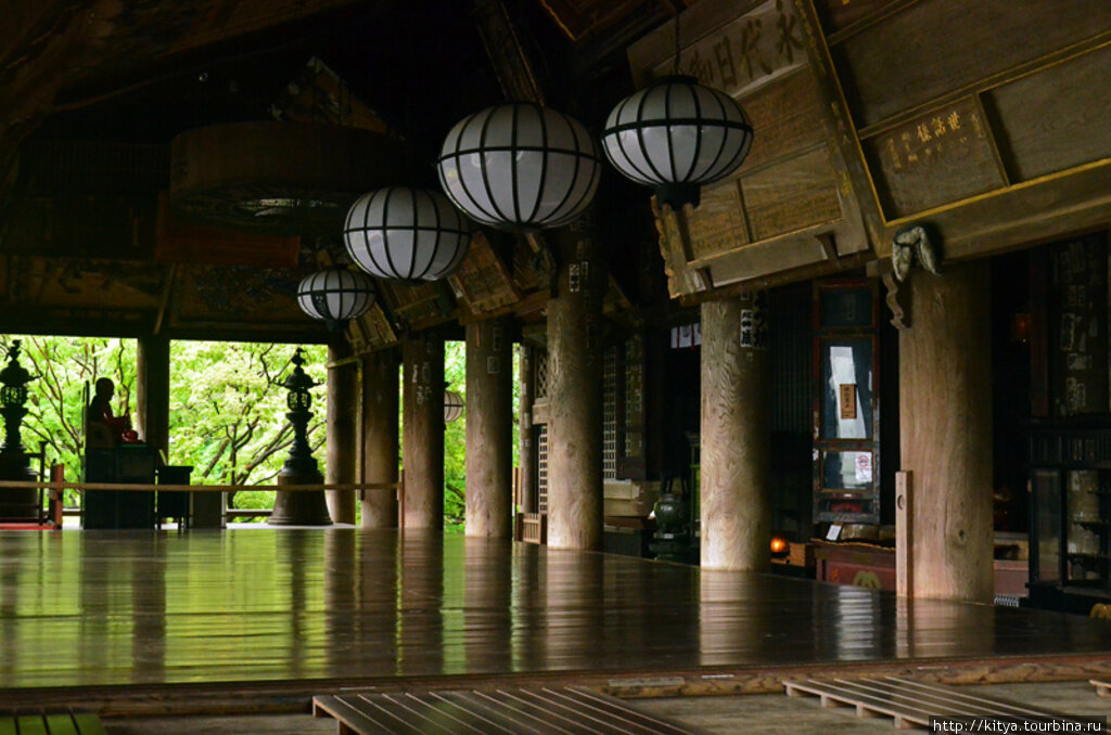 Главный холл, в котором стоит статуя – не только большой и красивый, но ещё и действительно старый, национальное сокровище. Перед ним площадка, с которой в ясную погоду должны открываться потрясающие виды (в ту погоду, которая досталась мне, виды были просто как виды). Статуя Каннон находится в глубине, и, в отличие от камакурской, частично скрыта за колоннами. В общем, не так близко и хорошо видна. Говорят, это самая большая деревянная статуя в Японии, но та Каннон, которая в Камакуре, нравится мне больше. Наверное, просто больше впечатляет, потому что лучше выставлена.