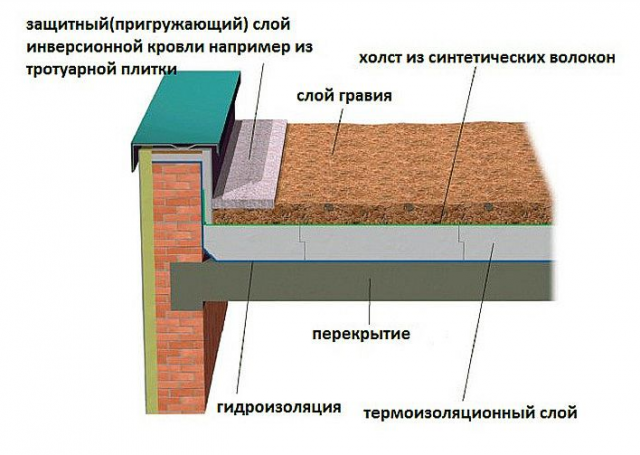 По другому располагаются слои в инверсионной кровле - они перевернуты. Таким образом, гидробарьер будет находиться под утеплителем, который станет оберегать его от резких температурных перепадов, воздействия ультрафиолета и атмосферных осадков.