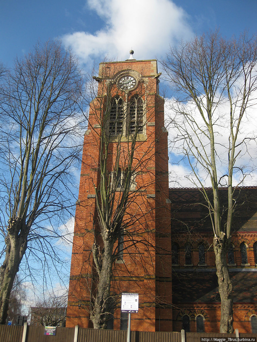 Настоящая церковь была построена между 1868 и 1871 годами из красного кирпича строительной компанией из города Тонбриджа, Кент. Красный кирпич, материал достаточно традиционный для строительства современной церкви, символизирует то, что на церкви мученическая кровь, кровь самого Христа.В 20 веке церковь достраивалась, следы практически не заметны на кирпичной кладке и крышеМногие детали интерьера и экстерьера являются подарками членов церковной общины. Например, эти часы были подарены Джозефом и Марией Грос в память об их сыне, Алберте, погибшем обслуживая Королевский Летный корпус. Так как башня не очень высокая, ее пришлось надстроить, чтобы часы были видны из окон дома Гросов.В 2000 году в церкви была совершена кража. Были разбиты несколько окон с витражами и украдены бесценные для церкви реликвии. К счастью они были найдены и отреставрированы.Теперь на окнах сетки (район не очень спокойный, так как рядом домашняя площадка "Нортгемптон Сайнтс", одной из лучших в Великобритании команд по рэгби, много игорных заведений...а куда пойти разгорячившемуся болельщику-игроку, разогнать печаль? Конечно же, на широкий церковный дворПоэтому мы нисколько не удивились, что в 2 часа дня, в воскресенье, церковь, расположенная в 1 миле от центра города, была закрыта.Желающие посмотреть внутреннее убранство церкви, могут пройти по ссылке.stjameschurchnorthampton.org.uЦерковь может быть интересна для посещения любителям военной истории, так как в ней находится мемориал в память о жителях района, погибших в ходе военных действий.При церкви есть своя школа.Рядом ведется строительство нового жилого комплексаКак видим, церковь Англии до сих пор играет важную роль в жизни общества в Великобритании.